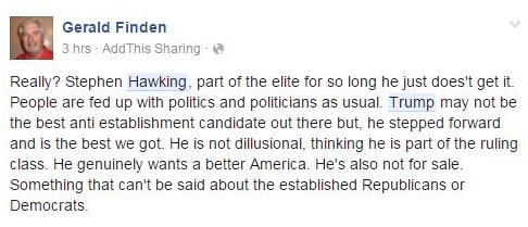 這位美國大叔今天早上在Facebook上發表了自己的看法:真假?霍金這樣的大牛竟然不懂這個道理?一直以來人們都受夠了玩弄政治的政治家,特朗普可能不是最好的反建制派候選人,但他作出了嘗試,這已經是我們最好的選擇了。他不是妄想家,不覺得自己是統治階級,他就是想讓美國變得更好。而且他是不會被收買的。建制派的民主黨人和共和黨人,有些東西沒法說。