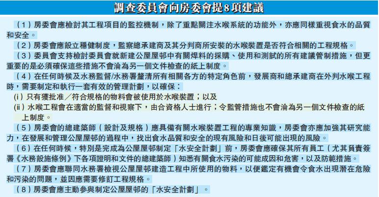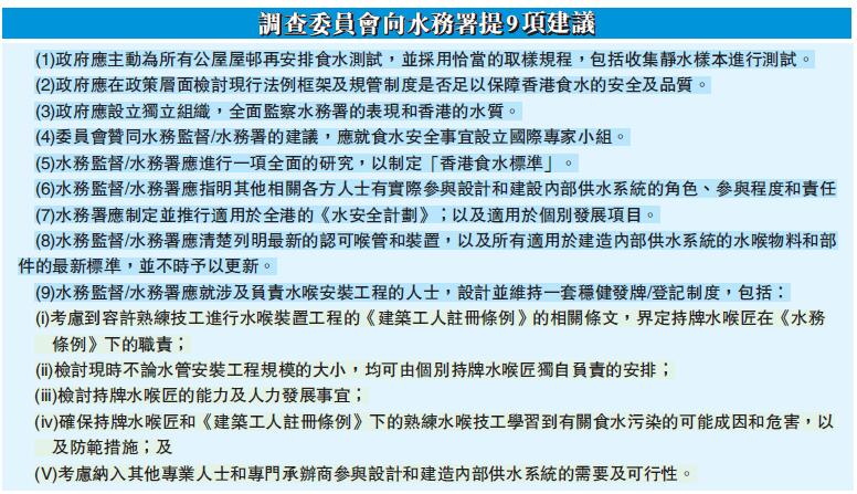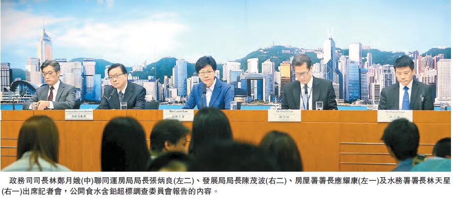 【香港商報网訊】記者葉佩瑜報道:港府昨日公布《食水含鉛超標調查委員會報告》,批評水務署、房委會、水管工程分判商及水喉匠等事件「持份者」是「集體失職及卸責」,未能防範供水系統使用不合格焊料;報告建議政府主動為所有公共屋邨再安排食水測試,及於政策層面檢討現行法例,及規管制度能夠有效保障香港食水的安全及品質。