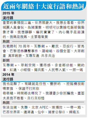「十大流行語」則從媒體視角出發,涵蓋國內外時政、經濟、科技和社會生活等多個領域。「重要的事情說三遍」「世界那麼大,我想去看看」「你們城里人真會玩」「主要看氣質」等成為2015年度網絡流行用語。