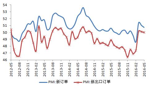 出口訂單指數小幅微降,外貿形勢改善仍需時日。出口訂單指數在2-3月連續兩個月上升后,4-5月連續微降0.1個百分點至50%。當前,我國外部需求環境并未出現根本性改善,出口訂單波動在所難免。今年4月,商務部新聞發言人指出,“全年外貿形勢仍然復雜嚴峻、不容樂觀”,或預示未來一段時間內我國外貿出口仍將面臨一定壓力。