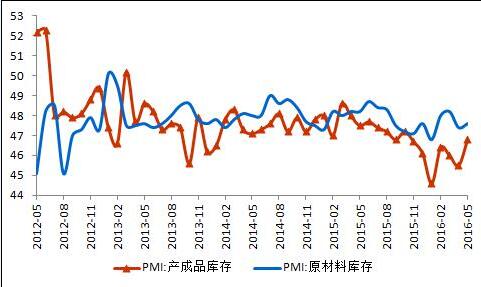 5月產成品庫存指數環比反彈1.3個百分點至46.8%,這與原材料庫存指數環比上升0.2個百分點也形成了分歧。產成品庫存代表下游需求的緊張程度,而原材料庫存則反映了上游供應商基于未來市場需求預期所作的決策。因此,供需兩端庫存指數的組合關系在一定程度上指明了未來制造業發展趨勢。原材料庫存指數+產成品庫存指數從上月的“雙降”組合演變為本月的“雙升”組合,一方面表明上游原材料供應商對于未來數月內制造業企業活動增強前景相對樂觀;另一方面,又顯示產成品去庫存推進不理想,未來補庫存需求仍將出現波折。