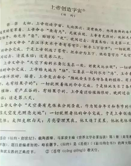 人民網北京6月1日電 (記者 熊旭)《圣經》寫入語文教材到底該不該?近日,不少網友對北京語文教材第13冊把《上帝創造宇宙》這篇基督教《圣經》內容被定為神話故事列入教材發表評論。