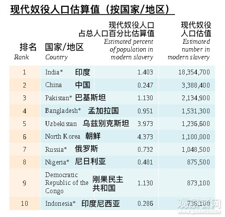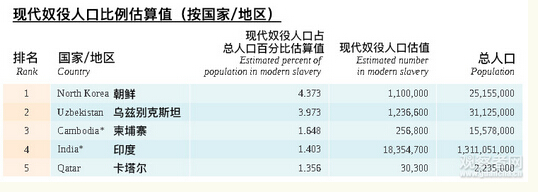 同時,在奴役人口占總人口比例上,朝鮮的奴役比例則最高,占總人口的4.37%,其次為烏茲別克斯坦(3.97%)、柬埔寨(1.65%)、印度(1.4%)和卡塔爾(1.36%)。