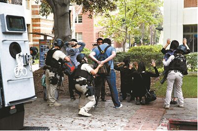 6月1日,加州大學洛杉磯分校,警察在槍擊事件后對人們搜身供圖/新華