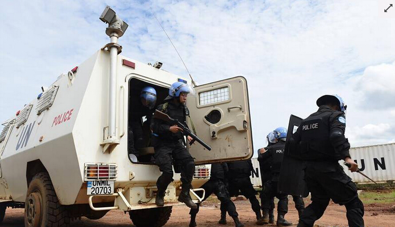 2016年6月1日,中國第四支駐利比里亞維和警察防暴隊應急處突分隊依托裝甲車,組成防暴處突隊形,進行掩護推進。