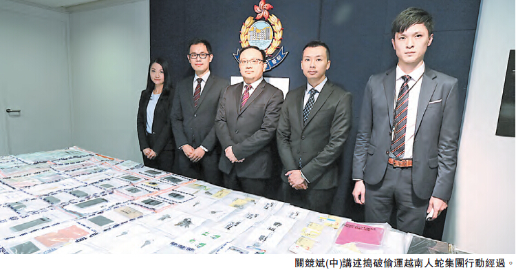 警方有組織罪案及三合會調查科(俗稱O記)關競斌警司昨日在記者會表示,本年3月,警方接獲線報,指一個活躍粵港兩地的販運「人蛇」集團,專門經內地偷運越南籍「人蛇」來港,港警與廣東省公安邊防總隊展開調查,分析「人蛇」集團的運作模式、偷渡路線及時間,並透過搜集及交換情報,最後得悉集團的成員資料。
