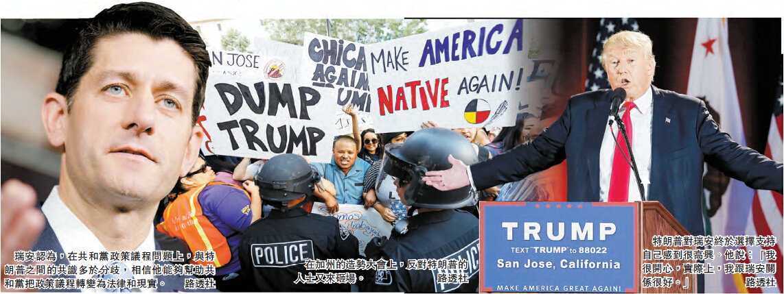瑞安當天在家鄉威斯康辛州的《公報》中作出上述表態。這意味特朗普成為共和黨「假定提名人」一個月之後,終於獲得黨內重量級大佬的「背書」。瑞安將在7月舉行的共和黨全國代表大會上擔任會議主席。多家美媒分析稱,瑞安此番表態意味共和黨內建制派勢力,向扛「反建制派」大旗拿下初選的特朗普妥協,雙方正逐步改善關係,朝大選方向鋪路。