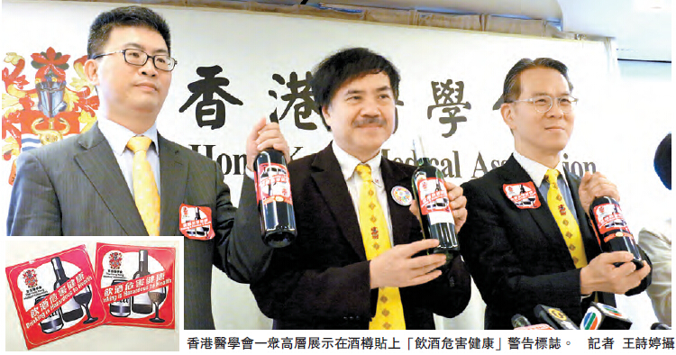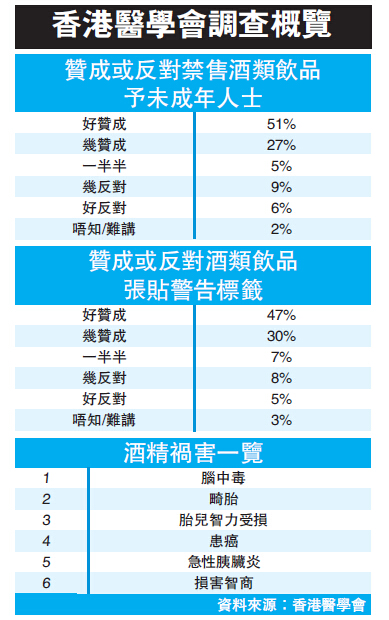香港醫學會聯同香港社會醫學學院,於5月3至5日就酒精飲品管制政策,委託港大民意研究計劃進行調查,成功以電話抽樣訪問超過1000名市民,回應率近七成。調查顯示,近八成人同意立法禁止超市、便利店和其他零售店,售賣酒精飲品予未成年人士;只有一成五反對有關措施。就強制酒精飲品包裝上,要張貼健康警告字眼,同樣獲得近八成受訪者支持,約一成則表示反對。醫學會副會長周伯展批評,香港沒有意識禁酒,遠落後於其他地方,因此提出兩點訴求,包括限制售賣酒精予未滿18歲人士,及在酒樽瓶張貼建康警告標籤:「貼曬成個樽身就最好」。他又指,酒樽警告標籤並非香港首創,其他地方如法國及西班牙早已落實。但他承認,實行這些措施或會受到商家反對,甚至出產國家政府也會反對。