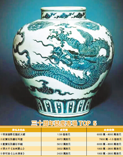 【香港商報網訊】5月30日下午,香港佳士得春拍「三十周年誌慶拍賣:世紀珍藏」在香港會議展覽中心舉槌,共推出30件拍品,但是在拍前,黃永玉的《梁山好漢》由於存在真偽爭議而被臨時撤拍,最終29件拍品共創下6.3156億港元的總成交額,總成交率為100%。此前已獲超高人氣的明代宣德青花龍紋大罐以2200萬港元起拍,幾經搶奪,最終以1.4億落槌,含佣1.58億港元成交,據透露,這件拍品的買家來自大中華區。香港商報記者黃鶯