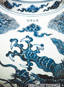 宣窯多被鑒賞家認為是中國青花制作的高峰,而宣德龍紋的描繪以矯健生動著稱。本件宣德青花大罐所繪龍紋即體現了這樣的特點,與此龍形相近似者見於美國波士頓美術館收藏的南宋陳容《四龍圖》與《九龍圖》中,可見宣德官窯御瓷亦受古畫的影響。這類大罐一般是宮殿陳設之用,與其可參照的兩件是署「大明宣德年制」、「御用監造」款的掐絲琺瑯龍紋大蓋罐,一件藏於英國大英博物館,另一件為Pierre Uldry珍藏。紐約大都會博物館及東京出光美術館各藏有一紋飾甚為相近之宣德款雲龍紋大罐,但上繪紋飾俱為三爪雲龍,如本拍品般繪有五爪雲龍紋的大罐至今可說是獨一無二。