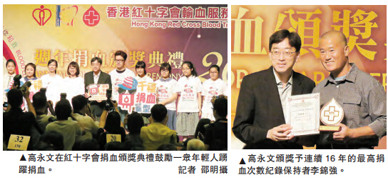 另一名受血病人、17岁小飞鱼林言臻,4年前因感冒菌入心引发心肌炎,令心脏无法运作,急需换心,手术过程输入多达67包血液;她坦言感激捐血者令其生命得以延续。颁奖礼上,获奖「常客」李锦强及黎静娴领受575次及325次捐血的奖牌及奖状,是本港捐血史上捐血次数「数一数二」的男女,2人都是由16、17岁起开始捐血。