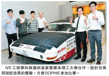 邹文瀚续指,为克服挑战,IVE工程学科与澳洲皇家墨尔本理工大学合作,设计仿风洞测试效果的实验,IVE将以流体力学的原理,设计了一套电脑模拟系统,为SOPHIE进行测试,而澳洲团队则在当地偌大的「风洞实验室」中,模仿真实的场景,以计算车身所受的风阻,相信研究结果将有助改良车身流线形状,减少电能流失,同时减低风阻,提高太阳能车的安全性。