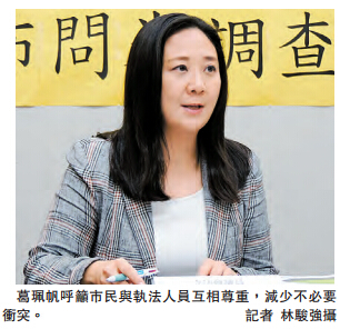 纪律部队关怀小组发起人之一、民建联立法会议员葛佩帆,昨日联同小组另外两位发起人包括退休警员林祖霖、警员家属何瑞眉,发布反映纪律部队面对压力情况的问卷调查。该调查於本年2月底至4月初进行,小组成员向纪律部队成员发出网上问卷,成功收回319份。调查的回覆者当中,来自警务处占最多,有237人(74%);其余回覆者还包括消防处有30人(9%)、入境处有21人(6%)、香港海关有14人(4%)等。