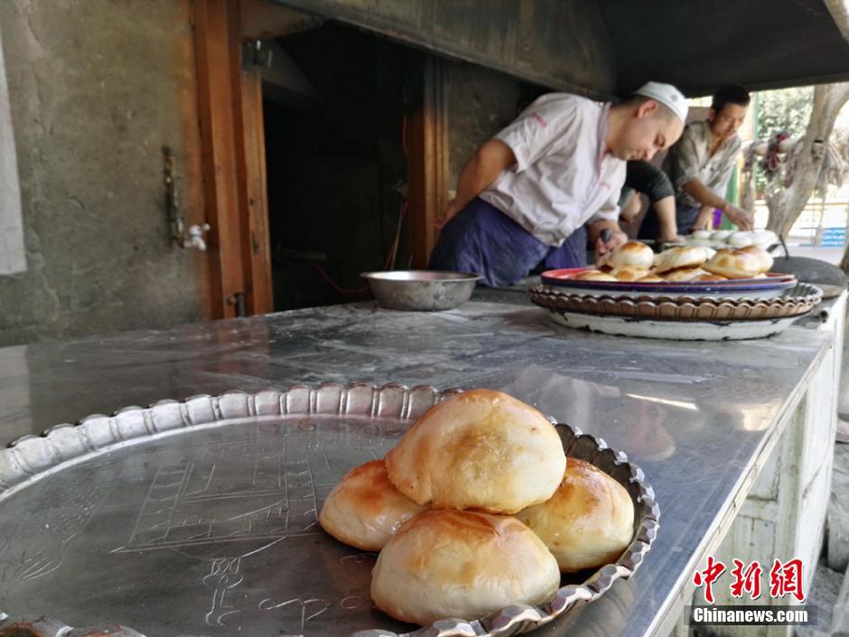 新疆喀什噶爾老城核心區包括四個街道辦事處的上百條街巷,面積3平方公里,生活著26575戶居民,他們中很多人是匠人,從事著坎土曼制作、陶器制作、花帽制作等古老行業,維持生計,傳承著千年技藝。圖為第一個馕坑的包子賣得很快,只剩4個。第二個馕坑里的包子也熟了,阿迪力用鐵鉗和大勺取熟了的包子。 王小軍 攝