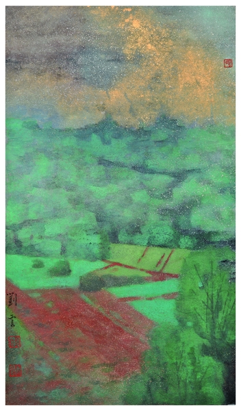 为了摆脱地域景观的局限,扩大作品的境界,刘云开始奔赴西北、远涉新疆,并学习宋人绘画。他的山水画艺术也进入了一个新的探索时期,追求跨越南派与北派、水墨与青绿、灵秀神秘与高旷浑劲,不久即出现了两种新的面貌。一种是近似传统小青绿的"水墨重彩",就画法而论,可能不无王希孟《千里江山图》的启发,但已经合水墨与重彩为一,打通了古代文人画家擅长的水墨山水与职业画师擅长的青绿山水,《梦里溪声》系列颇有代表性。这一系列的作品,每每像宋画的局部,层叠错杂的山岩钩斫精到,似在不同舞台灯光的映照下,以或青、或红、或淡绿、或浅橙的靓丽而润泽的色彩,从幽黑的暗夜中凸显出来。其中有些作品,取宋画半边的布局,把叠石流泉的鲜丽与高楼灯光的迷离相互映衬,很像在高楼旁叠石喷泉的宾馆,古意今情,迁想妙得。