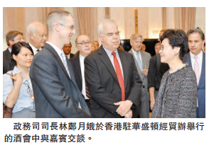 林郑月娥其後出席美国商会举办的商务午宴,并与商会成员就美国与香港的经济关系以及「一带一路」策略下在香港的商机交换意见。她说:「香港是世界上唯一一个聚集全球优势和中国优势的城市。这个独特之处让香港成为全球包括美国的投资者通往中国内地的门户。」