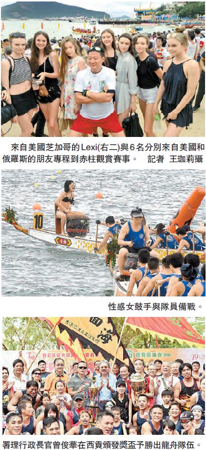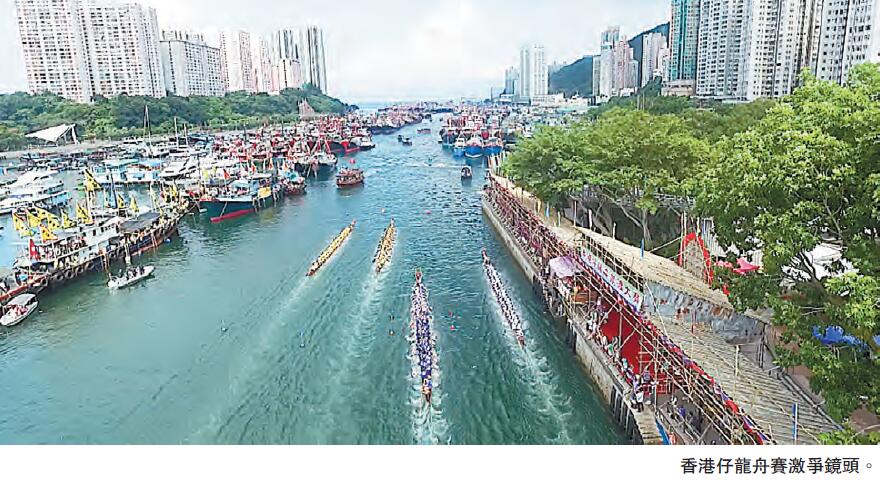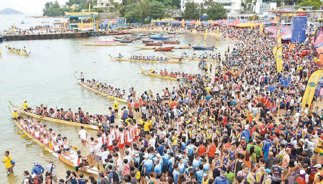 【香港商报网讯】记者王珈莉报道:昨日端午节,虽然天气炎热,间中有雨,仍然无损市民到全港各区观赏龙舟竞赛的兴致。香港仔、大澳、大埔海滨及沙田城门河等地,分别举行龙舟游涌及龙舟竞渡。其中全港最大型的「赤柱国际龙舟锦标赛」不单吸引逾280队海外及本地队伍,约6000名健儿云集赤柱,大会更举办龙舟嘉年华,逾20万名市民特意前往欢度端阳,齐齐「迫爆赤柱」。