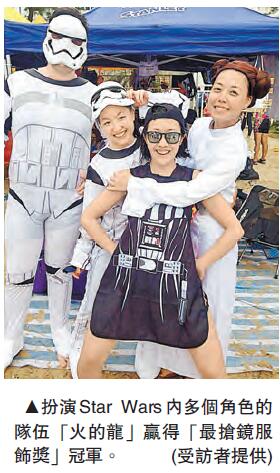 另一队以Iron Man(铁甲奇侠)及Captain America(美国队长)打扮的玩具公司「孩之宝」则获得季军。队员区小姐形容,现场气氛热闹,犹如大型户外Party。她说,公司每年均会参赛,今年约有50多名同事参加,认为竞赛可增加认识其他部门同事的机会,及团结彼此。