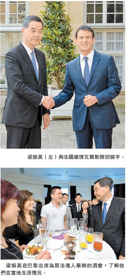 梁振英是次访问,主要是了解当地的航空、创新、科技产业。他昨日於法国的行程紧凑,在巴黎与法国总理瓦尔斯会面,双方就关注的议题交换意见。他之後於巴黎出席为居法港人举办的酒会,了解他们在当地生活和工作的情况,彼此亲切交流,气氛融洽;其间,特首有和来自香港的舞蹈演员林隽永作交流,後者是巴黎歌剧院芭蕾舞团首名华人芭蕾舞演员。