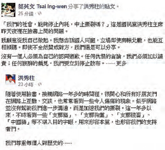 蔡英文分享洪秀柱網文,希望中止撕裂。