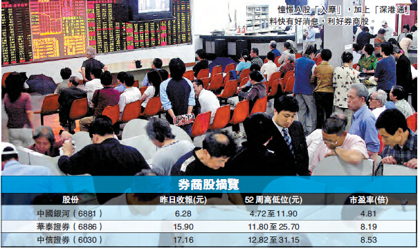 【香港商報網訊】MSCI將在下周三公布內地A股能否成功納入指數內。由於這是A股第三次闖摩,市場傳聞,為推動MSCI納入A股,中央或祭出殺手锏「深港通」。事實上,近日券商股股價已經顯著做好,在MSCI和「深港通」雙利好下,市場預期券商股的股價仍有上升空間,中國銀河(6881)、華泰證券(6886)和中信證券(6030)尤可看高一線。