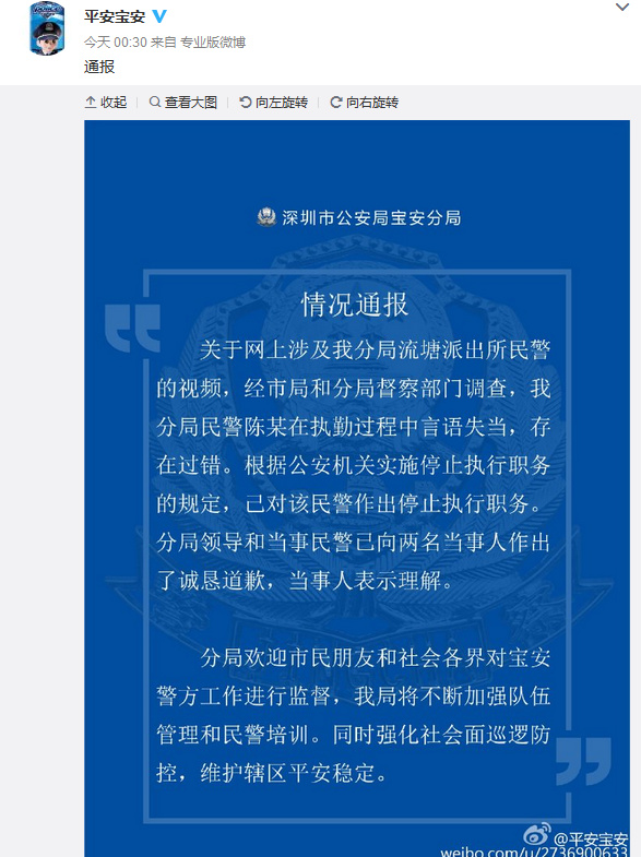 今日凌晨,寶安分局官微@平安寶安發布通告稱,經市局和分局督察部門調查,我分局民警陳某在執勤過程中言語失當,存在過錯。根據公安機關實施停止執行職務的規定,已對該民警做出停職處理。分局領導和當事民警已向兩名當事人做出誠懇道歉,當事人表示理解。