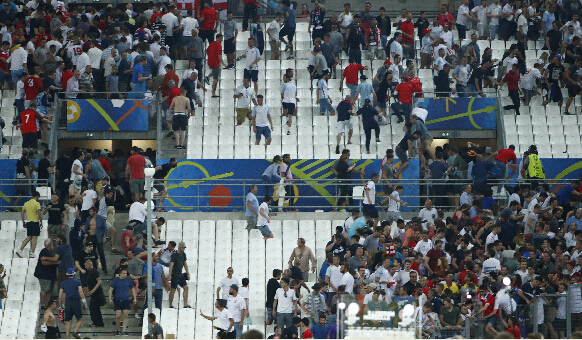 从11日下午4时开始,以俄罗斯和英国球迷为主的足球流氓相互挑衅,在被法国警方释放的催泪瓦斯驱散后,部分人“转战”临近街区。双方除了拳脚殴斗以外,还以啤酒瓶等物品为武器相互攻击。晚上8时左右,双方又在维罗德姆球场周边发生冲突。法国治安部队也成为攻击对象,被迫以催泪弹和高压水枪还击。