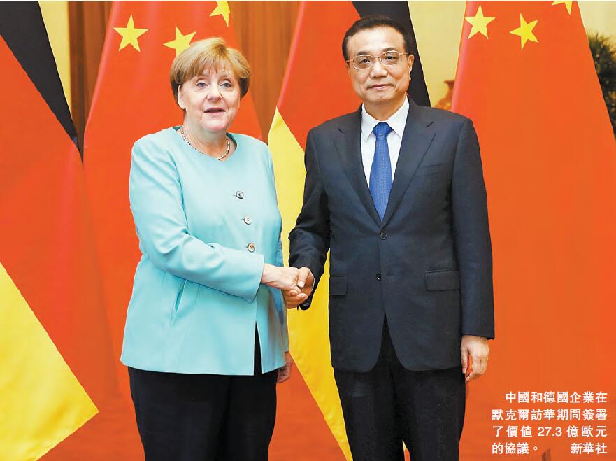 【香港商報网訊】中德總理在頤和園散步、共進晚餐后,昨日進入默克爾訪華的重頭戲。國務院總理李克強13日上午在人民大會堂北大廳舉行儀式,歡迎德國總理默克爾正式訪華,隨后,兩人共同主持第四輪中德政府磋商,兩國簽署了10多個領域的20多份合作文件。而據媒體報道,中國和德國企業在默克爾訪華期間簽署價值27.3億歐元的協議。