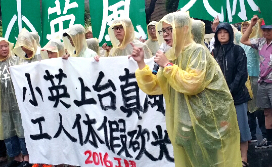台湾自2016年元旦起实施劳工周休二日,并将劳工的法定假日从19天减至12天,台湾“立法院”4月议决,将有争议性的施行细则退回劳动部修正。5月就任时对外宣称要还劳工7天假的劳动部长郭芳煜,不到一个月的时间就提出修法,周休二日资方仍可要求加班;另外还将删减7天法定假日,引发劳工团体强烈反弹。
