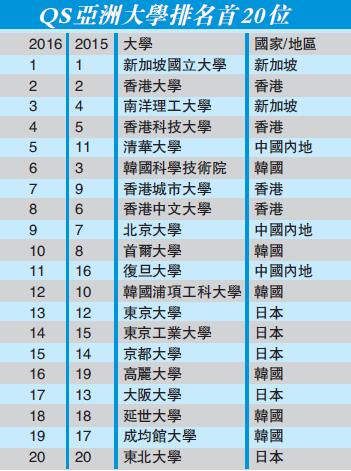 【香港商報网訊】全球高等教育分析機構QSQuacquarelliSymonds昨日發布本年《QS亞洲大學排名》榜。新加坡國立大學保持其區域第1的位置;本港4間大學排名前10名;清華大學、北京大學及復旦大學分別排第5、第9及第11位。由12位至20位的大學俱來自日本及韓國。