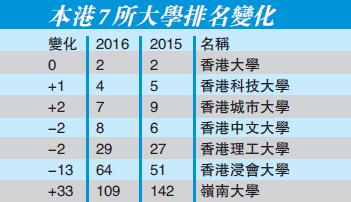在榜上香港的亮點,是擁有排名前10學校數量最多的地區;包括香港科技大學上升至第4,進一步向前3邁進;香港城市大學同樣提升了其排名,從去年的排第9上升至第7;香港中文大學保持其亞洲頂尖大學地位,但位置從去年的第6下降至第8;7所香港的大學進入亞洲前350,與往年一樣.由於排名位置的上升,這7所大學的平均位置從第34.6上升至第19,其中香港嶺南大學從第142飆升至109位。