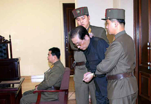张成泽(右二)双手被缚站在法庭。(图片来源:劳动新闻)