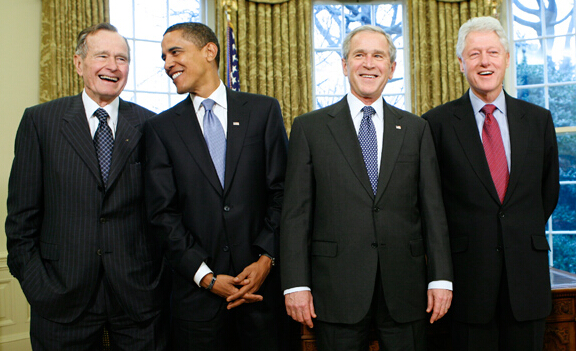 设计对白:“我们都接见过达赖喇嘛”(左起:老布什、奥巴马、小布什、克林顿)