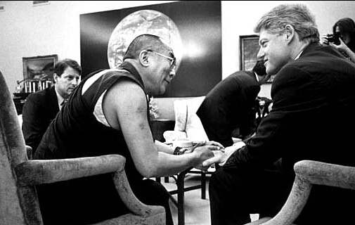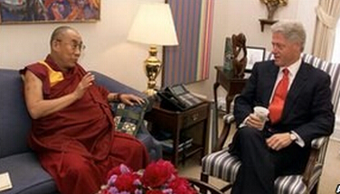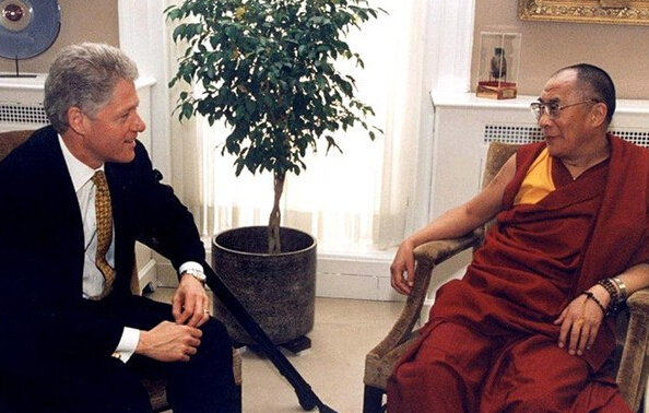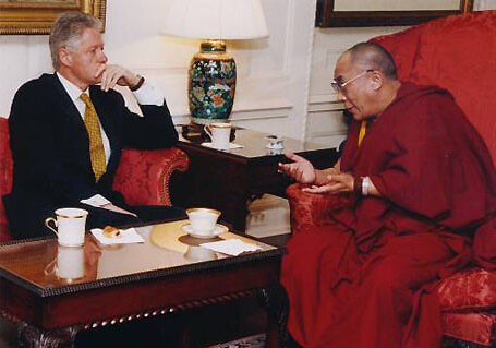 美国总统克林顿在白宫地图室会见达赖喇嘛。当时达赖正准备拜访第一夫人希拉里,克林顿以“顺道拜访”方式与喇嘛会面。