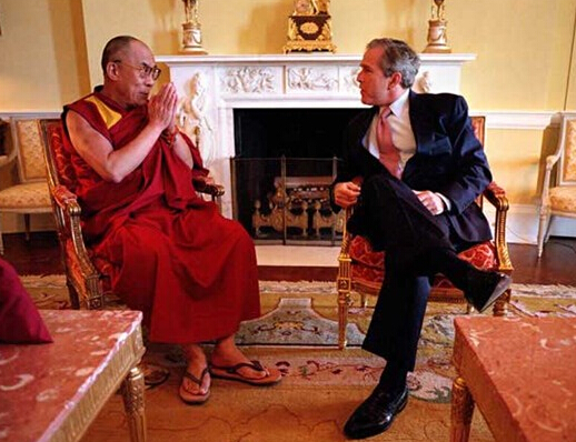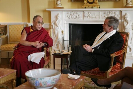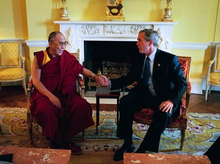 小布什在白宫私人住所会见了达赖喇嘛。美国白宫网站上公布的照片显示,小布什身披达赖献上的哈达,相谈甚欢。