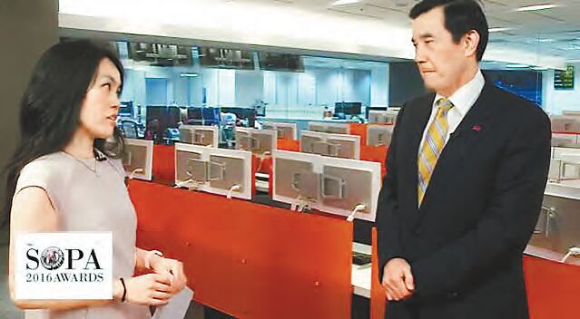 亚洲出版业协会(SOPA)昨晚在香港会展中心举行的「2016年度卓越新闻奖」颁奖典礼,原被邀请访港的马英九因未获台政府批准,未能出席。不过,在SOPA颁奖礼上,马英九仍有「现身」,以影片致辞,并委托彭博社台湾分社主任DebraMao代为专访马英九。