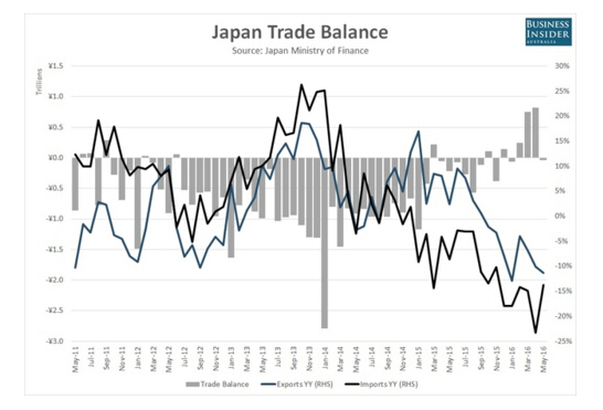 Business Insider的以下圖表展示了日本進出口貿易增長變化,藍線是日本出口同比增長走勢。