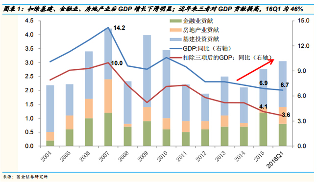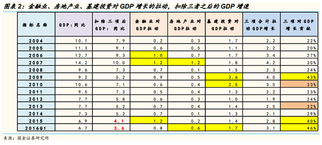 國金證券魏鳳、曹燕萍認為,鑒于宏觀增長數據的相對穩定和微觀層面上疲弱數據的背離,在GDP數據中去掉受政策影響較大的基建投資和虛擬經濟后,方能反映經濟增長的內在動力。