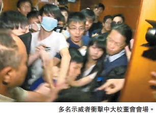 在會議開始前,中大學生會向沈祖堯及梁乃鵬請願,要求在議程中加入討論成立專責小組,檢討特首校監必然制及在小組中加入學生代表。期間約50名示威者突然欲衝入會場,當中有部分人並非中大學生,包括人稱「四眼哥哥」的社運人士鄭錦滿及港大學生會會長孫曉嵐,有部分人穿上黑衣及戴上黑帽口罩,甚至有人以面紗遮住樣貌,他們與保安發生衝突,導致有保安員受傷流血,數名示威者一度成功衝入會場,他們其後全數返回場外。