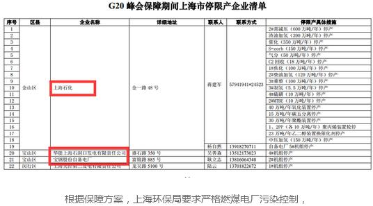 點擊查看上海市環境保護局印發的《G20峰會上海市環境空氣質量保障方案》的通知,方案并附上了G20峰會保障期間上海市停限產企業清單。