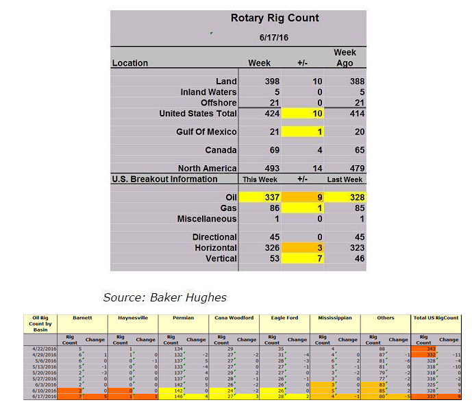 最近的鉆井機數量攀升是一個有趣的反轉。截止5月中旬油價回升至每桶47美元的時候,美國石油鉆井機數量在之前21周當中有多達20周都是減少的。