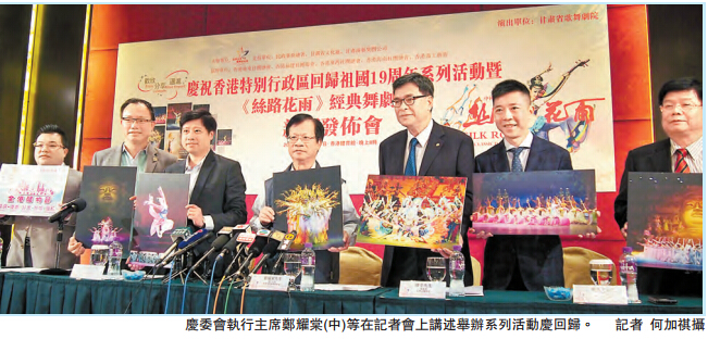 【香港商报网讯】记者米雪尔、何加祺报道:今年是香港回归祖国19周年,香港各界庆典委员会及各大团体於全港各区筹备逾210项活动,预计可吸引和动员逾30万市民参与。今年的「七·一」庆回归系列活动主题为「欢欣分享迈进」,重点活动则为《丝路花雨》经典舞剧演出,於7月1日起一连三晚在红磡体育馆演出。庆委会执行主席郑耀棠在记者会上表示,今年的「七·一」庆回归系列活动主题为「欢欣分享迈进」,希望与大家共同分享庆回归的喜悦,继续发扬港人刻苦耐劳、勤奋拼搏、自强不息的「狮子山」精神,放下政治争拗,为香港注入更多正能量。