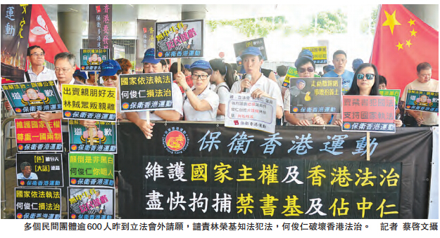 【香港商报网讯】记者林骏强报道:反对派借铜锣湾书店事件肆意炒作,引来各界质疑。多个民间团体包括保卫香港运动、爱港之声等合共逾600人,昨日到立法会外请愿,促请当局尽快拘捕铜锣湾书店店长林荣基及提供协助的民主党立法会议员何俊仁。保卫香港运动对事件提出四点谴责,包括林荣基知法犯法、铜锣湾书店其他职员等访问印证林荣基诚信破产、法律界鲜有教育市民返回内地时要遵守内地法例,及何俊仁公然为林荣基护航保驾的行为,是破坏香港法治。