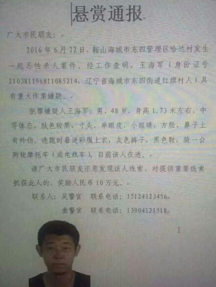 鞍山市公安局一份悬赏通报称,东四街道红旗村的48岁男子王海军有重大作案嫌疑并在逃,警方悬赏10万缉凶。