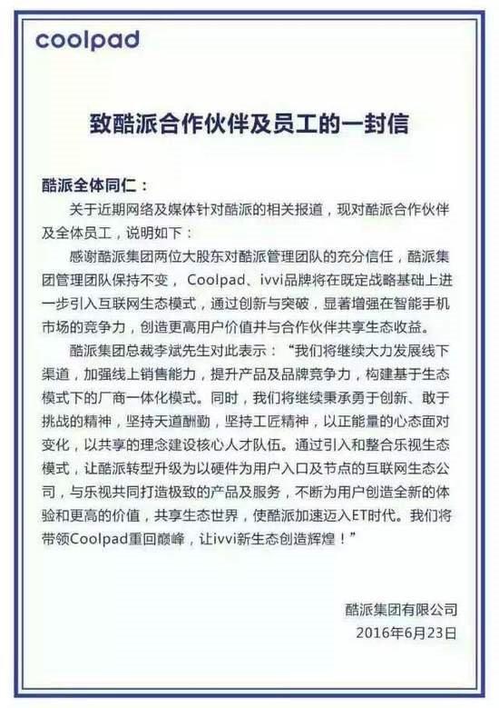 上周五,酷派發布公告稱,樂視將成為酷派第一大股東。但公告中只談及了交易金額,並未透露樂視控股後酷派集團的發展和即將發生的人員變動。而現在,酷派向全體員工發布了內部信,正式公布了酷派未來的發展方向。