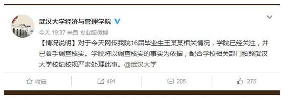 今天上午,一则反映武汉大学经管学院大四学生王某某的约炮爆料,在网上热炒。今晚7时许,武汉大学经济与管理学院回应称:今天网传我院16届毕业生王某某相关情况,学院已经关注,并已着手调查核实。学院将以调查核实的事实为依据,配合学校相关部门按照武汉大学校纪校规严肃处理此事。