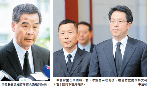 【香港商报网讯】记者戴合声、何加祺报道:九龙湾淘大工业村迷你仓4级火警连烧4昼夜未熄,2名消防员张耀升与许志杰於火警中英勇殉职,令全城市民深感惋惜及哀恸。消防处昨日起於观塘消防局及将军澳消防及救护学院设置了吊唁册,多位官员及市民昨到场吊唁致哀,包括行政长官梁振英伉俪、中联办主任张晓明、保安局局长黎栋国等多人。张晓明对於有消防员殉职表示沉痛哀悼,并称港澳办、公安部已与特区政府商讨,如本港需要内地提供协助,内地会尽最大努力帮忙;行政长官梁振英及保安局局长黎栋国亦呼吁市民要相信消防员的专业;黎栋国更希望市民对消防员给予支持而非责难。