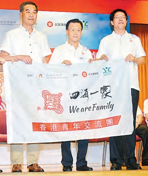 交流團昨日舉行授旗禮,行政長官梁振英、中聯辦主任張曉明等出席。新家園協會董事會會長、交流團團長許榮茂致辭時表示,去年8月成功舉辦了第一屆「四海一家香港青年創新創業交流團」,組織2000多名香港青年到北京、上海及廣東參觀、學習、交流。承接去年的成功經驗,今年再接再厲,舉辦第二屆「四海一家香港青年交流團」,希望啟發香港青年更全面深入地認識、貢獻祖國。