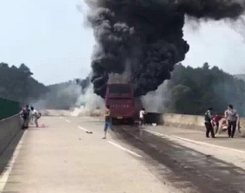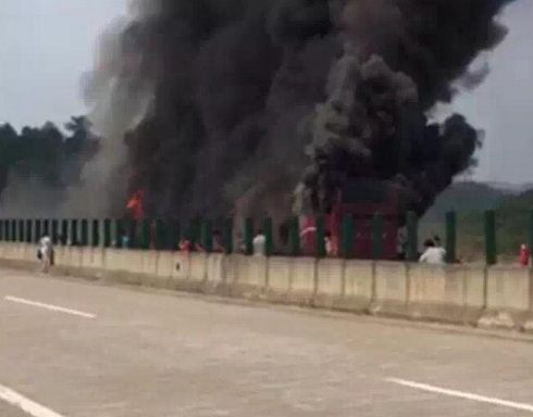 據報道,大巴車上有56人。圖為事故現場濃煙滾滾。