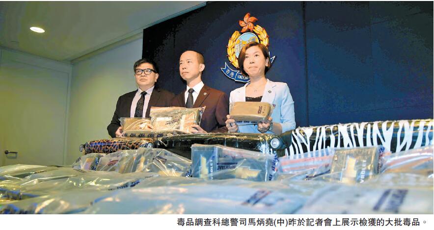 【香港商报网讯】记者万家成报道:警方毒品调查科於8日内第二度破获逾亿元毒品案,继本月中在落马洲检获市值9900万元的可卡因毒品后,上周五再於观塘及粉岭检获127公斤可卡因、一批冰毒和大麻花等,总值约1.32亿元,乃自2013年以来单一最大宗可卡因案,3名男子被捕扣查,由於两宗案检获的可卡因包装方法及图案相似,警方不排除总值逾2.3亿元的毒品来自同一出产地南美洲,惟未知两案是否有关连。